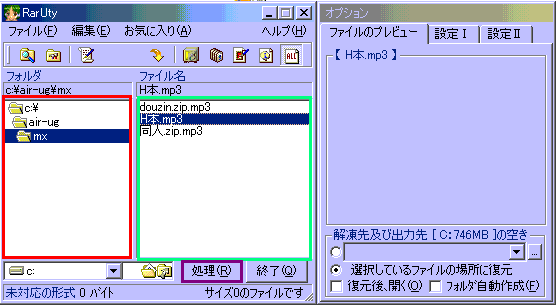 ファイルが腐るほどあって、一つ一つは面倒くさいというかたは、全て選択して「処理」を押せば一括処理をしてくれます。全て選択するには「緑の枠で囲まれている所の空白を選んで左クリック→左クリックしたままマウスを上か下に動かす」という動作を行ってください。