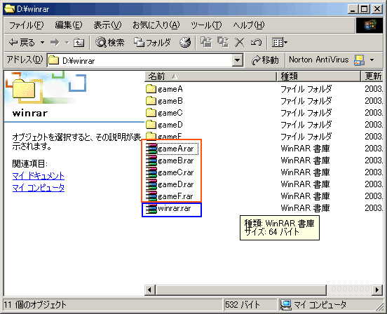 クローン形式のゲームを圧縮されたファイルなどでしたら、解凍時には「.ccd .cue .img .sub」の4つのファイルしか出てきません。しかしこれがロム詰め合わせや、同人誌詰め合わせなどでしたら、膨大な数のファイルが1つに圧縮されていることになります。その膨大な圧縮ファイルの中で「1つだけのファイルを取り出したい」という場合はどうしましょう。時間を掛けて全部解凍すれば良いのですが、急いでいる方や、HDに余裕が無く狙ったファイルだけ取り出したい方もいるかと思います。そんな時のも力を発揮するのが、WinRARです。