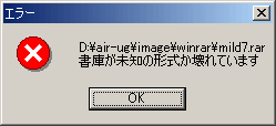 これを普通にWinRARで解凍すると、エラーが表示されて解凍はされません。mild10というフォルダは出てくるのですが、中には肝心のMild7.txtがありません。下の画像は、解凍の際に表示されるエラーメッセージです。このような表示がされて解凍できません。