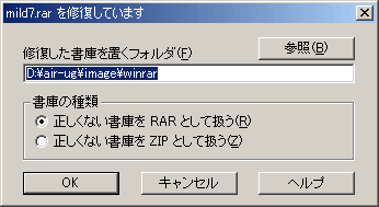 ここでは何も考えずに「OK」を選択。破損ファイル(今回はmild7.rarがあるフォルダと同じ所に、修復したファイルを置きます)