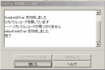 これで修復は完了です。それでは問題のmild7.txtを取り出してみましょう。とここで注意点が1つ。修復後に「mild10.rar」を解凍しようとしても、正常に解凍できません。それもそのはずで、mild10,rarは壊れたままのファイルですので。
