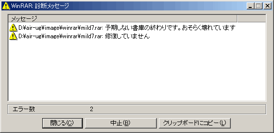 上のmild7.rarというのをDLして、WinRARで解凍してみてください。きっと上と同じエラーが出ます。下の画像は破損ファイルを修復しようと試みたもの。