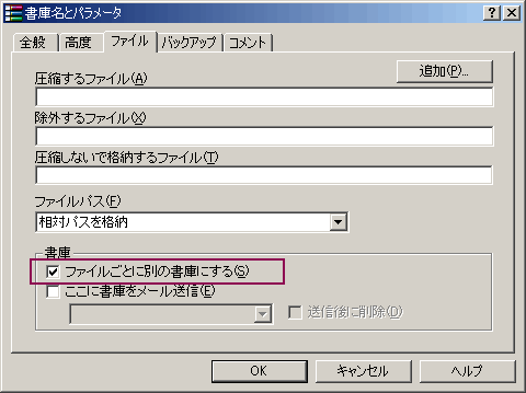 次に出てくるウィンドウで「ファイル」を選んで、赤枠で囲んだ所「ファイルごとに別の書庫にする」のチェックボックスにチェックを入れて下さい。これでフォルダごとに圧縮が可能になります。この際に設定でリカバリレコードを3%に設定しておけば、全ての圧縮ファイルにそれぞれリカバリレコードが付加されます。つまりここで設定されたことは、圧縮されたファイル全てに適用されるわけです。