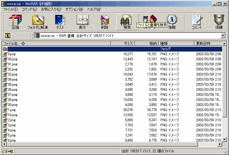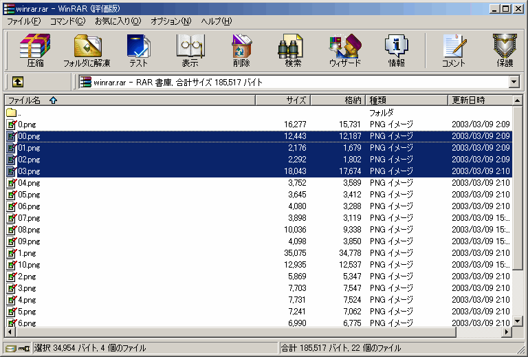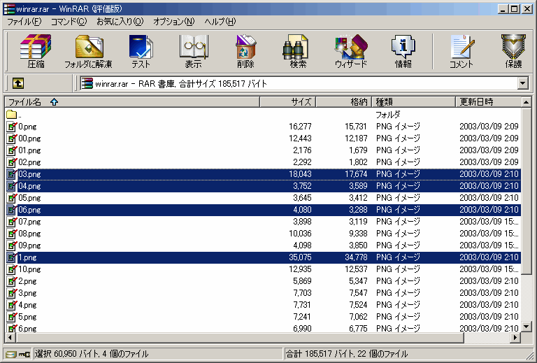 「00.png 01.png 02.png 03.png」のみを解凍したい場合は、このように選択してから「フォルダに解凍」ボタンを押します。複数選択した場合は「Shift」キーを押しながら、マウスで選択してください。