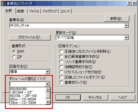 さきほどのリカバリレコードを付加する時に使用した画面です。WinRARでは圧縮する時に、毎回この画面が出てきます。それで今回の圧縮して分割は、赤枠で囲んだ所で指定できます。 ▼ボタンを押せばウィンドウが出てきますし、そのまま分割したいサイズを入力することも出来ます。が▼ボタンを押して指定する方が楽なので、そちらを活用してください。