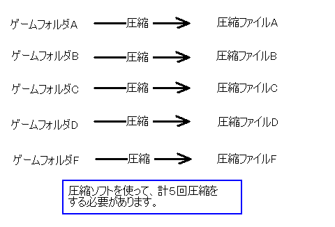 映画・動画などのMPEGファイルなら、そのままHDに移せばオッケーです。しかしccd形式のゲームなどを圧縮されたままではなく、クローンCDを使ってCDに焼いた方は多少面倒な作業が必要になります。バックアップCDをCDドライブに入れて、クローンCDを使いイメージファイルとしてHDにコピー、その後圧縮ソフトを使って圧縮することになります。その作業だけでも面倒くさいですが、一番面倒くさいのは最後に圧縮することになります。ゲームファイルをそれぞれフォルダに入れて、1つずつ圧縮することになります。しかしWinRARを使えば、一度に全てのフォルダを圧縮することが出来ます。