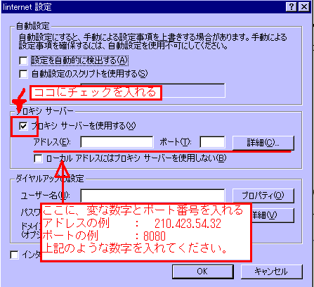 串サイトでは「210.432.54.32:8080」といった形で串が配布されていますが ポートの「8080」に注意して下さい。 こいつを入れ忘れると串が通らないのですが、結構あるミスみたいです。