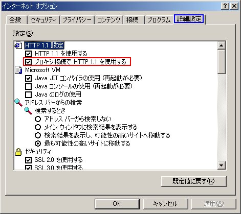 「プロキシ接続でHTTP1.1を使用する」にチェックを入れる。