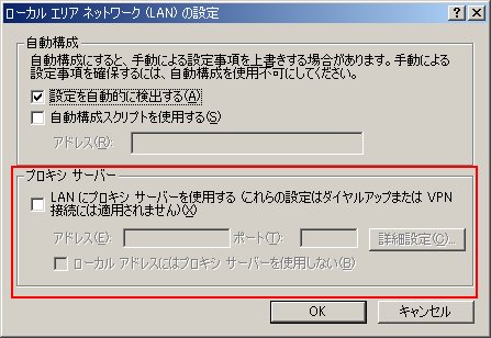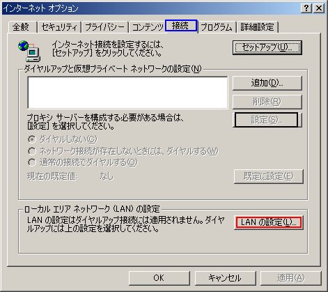 インターネットオプションの接続タブ→赤枠で囲ったLANの設定タブと進む。