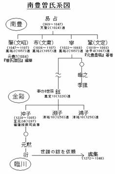 [22] 『道園学古録』四〇「跋曾氏世譜後」「南豊曾氏之族……命其子衍、以南豊金谿曾氏世譜示集。受而読之、作而歎曰、「善夫、文昭公元豊七年所為族譜叙也」。文昭之言曰、「家伝旧世系、以為温彦博・高士廉所撰、而有不敢信者、経唐末五代之乱。又有不可考者、自其身追尋先集之遺、至其郷石記鐘銘之属、得其六世之名。諱猶有不能尽知者」。蓋慎之至也。……世之人、曾不知古人之意、妄引名族賢者、而自附焉、覬以自表、而不知誣祖之罪、其為不孝甚大、而其官爵年代参錯、舛誤徒貽識者之笑歎。……集嘗観于臨川之乗、自宋初有黄門楽侍郎、晏元献公、王荊公之家。楽之子孫尚多。晏亦有之。而王氏之後、分居金陵、其後人特少、南城旣自為郡、南豊又别為州、其居金谿者、復為臨川之大族」。