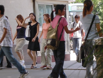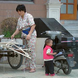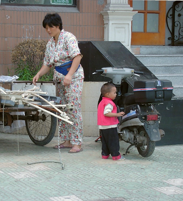 出稼ぎ労働者の夫の仕事場の前で一日を過ごす妻と子供
