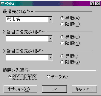 「最優先されるキー」「2 番目に優先されるキー」「3 番目に優先されるキー」は、キー項目が複数あるときに、各項目の並び替え規準優先度を示します。 「昇順」「降順」は、値による基準で、「小→大(昇順)」「大→小(降順)」となります。 「範囲の先頭行」は、リストの先頭行に見出しがあるときは「タイトル行」、無いときは「データ」を選択します。「データ」を選択するとリストの先頭行を含めてソートします。 「オプション(O)」ボタンは、特別の並び替え方法や、詳細な指定を行うときに使用します。 |