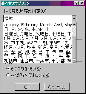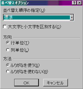 「並び替え順序の指定(U)」では、メニューの「ツール(T)」「オプション(O)」で作成した「ユーザー設定リスト」の登録順による並び替えを指定できます。 「大文字と小文字を区別する(C)」は、大文字・小文字を区別してソートするときに、チェックボックスをオンにします。 「方向」の「行単位(T)」オプションボタンをオンにすると、列の値をキーにして行を並べかえ、「列単位(L)」オプションボタンをオンにすると、行の値をキーにして列を並べかえます。 「方法」でふりがなにより並べかえるときは「ふりがなを使う(S)」オプションボタンをオンにします。 |