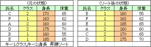 注1) ソート範囲で複数列を選択したときは、アクティブセルの属する列(左端列)がソートキーとなります。 | ||