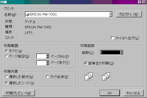 選択したシート | 選択されているシートごとに印刷します。 なお、シートに印刷範囲が指定されているときは、印刷範囲だけが印刷されます。 複数シートを選択する方法は(注2)を参考にしてください。 |