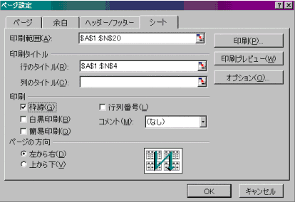 印刷範囲(A) | 「印刷範囲」ボックスの右端にあるダイアログ縮小ボタンをクリックして(ダイアログボックスが折りたたまれる)印刷範囲をドラッグし、再度ダイアログ縮小ボタンをクリックする(ダイアログボックスが元に戻る)と、印刷範囲が入力されます。 | |