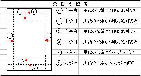 タブ中の各項目の意味と用紙の中での位置は、下図のとおりです。 なお、「ページ中央」の「水平(Z)」「垂直(V)」のチェックボックスをオンにすると、印刷可能領域(余白以外の領域)の左右の中央または上下の中央にデータが印字されます。 |