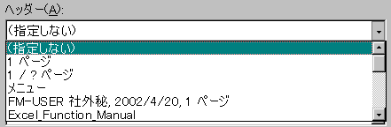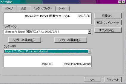 ヘッダーに文字を表示するには、「ヘッダー」ダイアログボックスで次の手順により行います。 1 表示位置を決める 「左側(L)」「中央部(C)」「右側(R)」の編集ボックスをクリックする。 2 任意の文字を入力する 任意の文字を表示したいときは、編集ボックスで文字を入力した後、入力文字をドラッグしてから「フォント」ボタンをクリックし、「フォントの設定」ダイアログボックスで「フォント名」「スタイル」「サイズ」その他の設定を行い、「OK」ボタンをクリックします。 3 頁番号、総頁数、日付、時刻、ファイル名、シート名の挿入 表示位置の編集ボックスで、挿入したい項目のボタンをクリックすると挿入項目名が表示されます。項目の前後または項目と項目の間には任意の文字を入力することもできます。 たとえば、「右側(R)」の用紙の右上端に「Page」の文字に続けて頁番号/総頁数を表示したいときは、下記のように指定します。 1 「右側(R)」編集ボックスをクリックします。 2 「Page 」の文字を入力します。 3 続いて「頁番号」ボタンをクリックします。 4 「/」を入力します。 5 続いて「総頁番号」ボタンをクリックします。 指定結果は、次のように表示されます。 Page &[ページ番号]/&[総ページ数] |