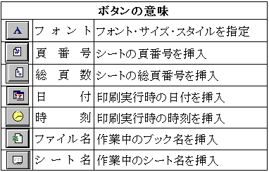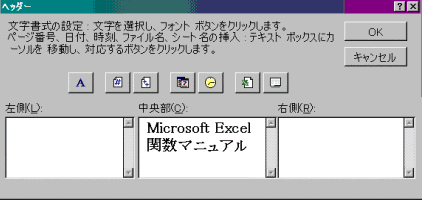 「ヘッダーの編集(C)」ボタンをクリックすると「ヘッダー」ダイアログボックス(上図)が表示されます。図は、ヘッダー「中央部(C)」に「Microsoft Excel 関数マニュアル」という文字を入力後、フォントを「MS P明朝、太字、12ポイント」に指定した結果です。 図の中にある各ボタンの機能と意味は下図のとおりです。 |