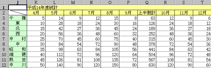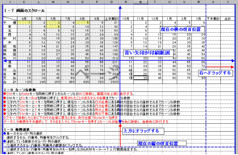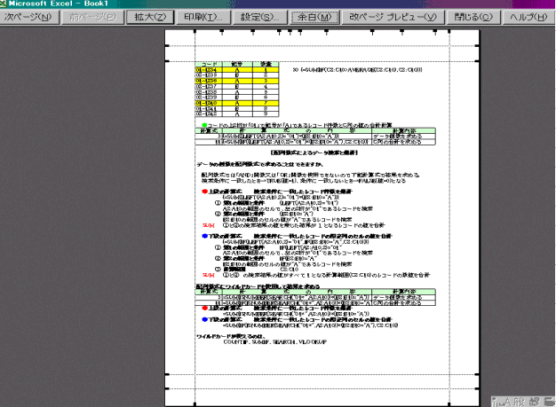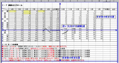 上図は、メニューの「表示(V)」「改頁プレビュー(P)」を選択したときの画面です。 任意の範囲で改頁を行うには、縦または横の青い破線をドラッグします。縦または横の破線を左右または上下にドラッグすることにより印刷幅・高さが拡大・縮小します。 また、改頁プレビューで印刷範囲の変更を行うと、設定されている用紙サイズ、用紙方向のに応じて、自動的に拡大縮小印刷の縮尺率が設定されます。 元の画面に戻るときは、メニューの「表示(V)」「標準(N)」を選択します。 下図は、上図の印刷範囲を拡大した結果です。 |