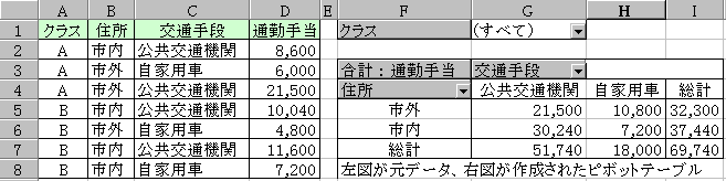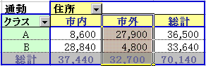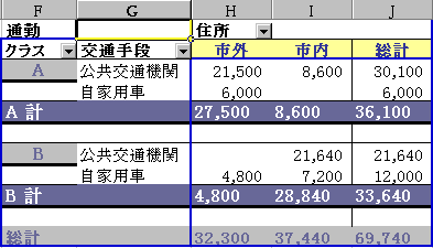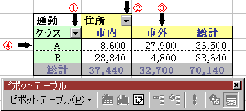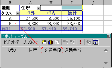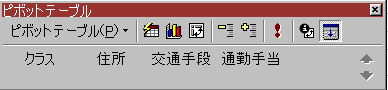 上図は、表部分がピボットテーブル、表の下部分が「ピボットテーブルツールバー」です。 ピボットテーブルツールバーに表示されている「クラス」「住所」「交通手段」「通勤手当」は、フィールド名のボタンです。 図では、「交通手段」のフィールドボタンをピボットテーブルの行エリアにドラッグしてフィールドを追加する処理を表しています。下図は、追加した結果のピボットテーブルを示しています。 |