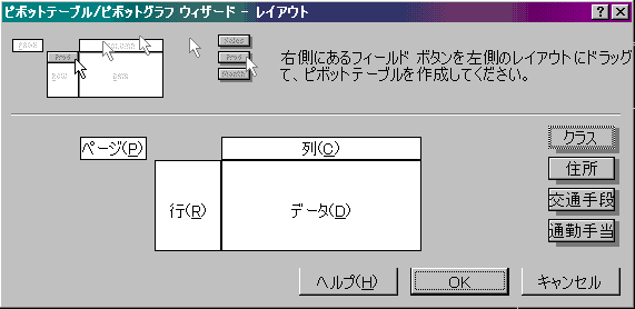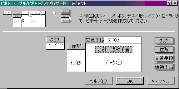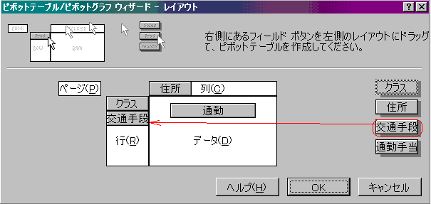 上図は、「ピボットテーブルウイザード3/3 レイアウト」ダイアログボックスです。 「交通手段」フィールドボタンを行エリアへドラッグして、データ項目の追加を行う処理を示しています。 |