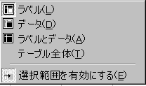 レコードのアイテムとデータ | 1. 上図 C の位置にマウスを近づけ、マウスポインタが黒い矢印に変わってからクリックします。(各レコード単位で指定します。) 2. 「フィールドラベルとアイテムの選択」の 2.3 を実行します。 既定値は「ラベルとデータ(A)」になっています。選択したレコードのアイテムとデータが選択されています。 |
