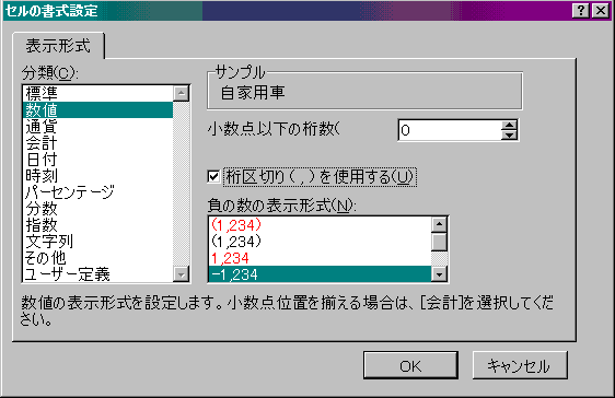 下図は「ピボットテーブル フィールド」ダイアログボックスで「表示形式(N)」ボタンをクリックしたときに表示される「セルの書式」ダイアログボックスです。 「分類(C)」欄で書式を選択すると、右側に書式の詳細を指定するオプションが表示されますので、必要な指定を行います。 |