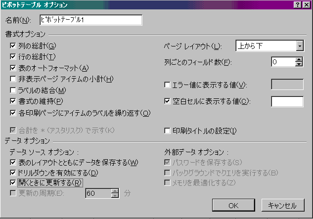 外部データソース(E) | 作業中のブック以外のファイルやデータベース、またはExcel以外のファイルやデータベースからピボットテーブルレポートまたはピボットグラフレポートを作成します。 | |