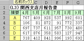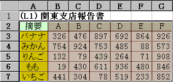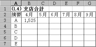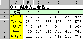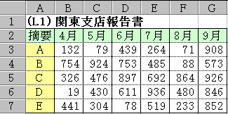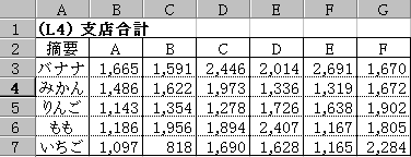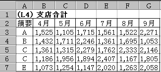 下表は、(L1)〜(L3)のワークシートの各支店データを(L4)の支店合計シートに統合によりした結果です。