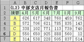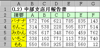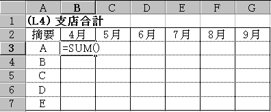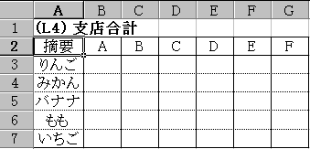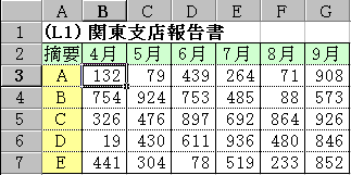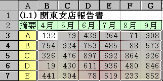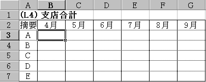 下表は、同じ形式の(L1)〜(L3)ワークシートの各支店データを(L4)の支店合計シートに統合によりした結果です。