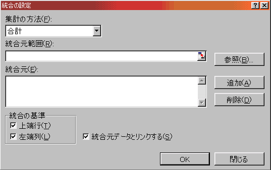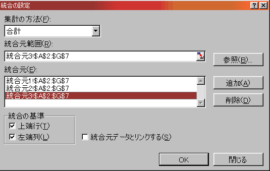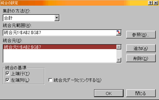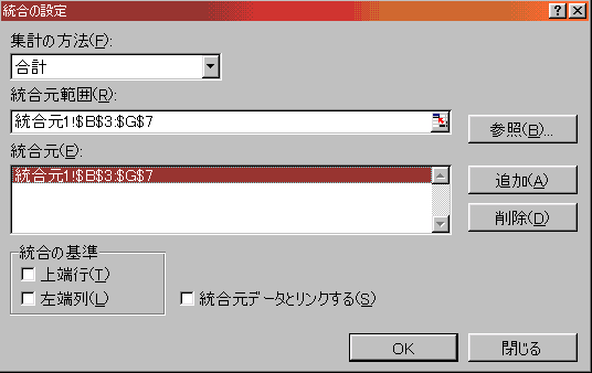 7. 「統合の基準」の「上端行(T)」「左端列(L)」のチェックボックスはオフにしておきます。