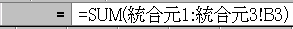 なお、セルB3をクリックすると、数式バーで入力された計算式(下右図)を見ることが出来ます。数式の意味は、シート「統合元1」からシート「統合元3」までのセルB3を合計する、を表しています。