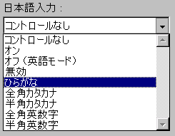 A列に、かな・漢字混じり、B列には半角カナ、C列に数値のデータを入力しようとすると、列が変わるごとにIMEモードを切換える必要があります。このようなときには、予めIMEモードの設定を行います。 IMEモードの設定とは、IMEツールバーの左端にある「あ」の部分を自動的に変更して、入力モードを切換える処理のことです。 設定方法は、設定する列(セル範囲)を選択してから、メニューの「データ(D)」、「入力規則(L)」を選択します。次に「日本語入力」タブの「日本語入力」ボックス(左図)の▼ボタンをクリックして、入力モードをクリックし、「OK」ボタンをクリックします。 |