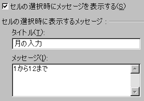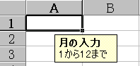 メッセージの設定方法は、設定するセル範囲を選択してから、メニューの「データ(D)」、「入力規則(L)」を選択します。 次に「入力時メッセージ」タブの「セルの選択時にメッセージを表示する(S)」チェックボックス(左図)にチェック(レ)がオンになっているかを確認し、「タイトル(T)」、「メッセージ(I)」欄に表示する文字を入力し、「OK」ボタンをクリックします。 左図は、「タイトル(T)」に「月の入力」、「メッセージ(I)」に「 1 」から 12 」までを入力したもので、右上図がセルでの表示内容です。 |