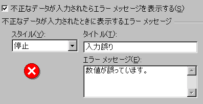 上図は、「スタイル(Y)」で警告マークを選択し、「タイトル(T)」に「入力誤り」、「メッセージ(I)」に「数値が誤っています。