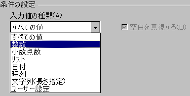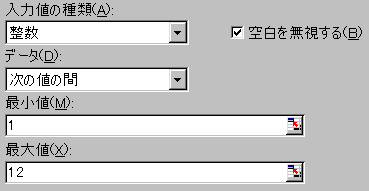 セルに一定範囲の数値や日付、時刻しか入力できなくするには、入力規則で条件を設定します。入力規則の設定で指定できる入力値の種類は左下図の内容です。 設定方法は、設定するセル範囲を選択してから、メニューの「データ(D)」、「入力規則(L)」を選択します。次に「設定」タブの「入力値の種類(A)」ボックス(左図)の▼ボタンをクリックして、入力種類をクリックすると、右下図のようにダイアログボックスが変化しますので、条件の設定を行い、「OK」ボタンをクリックします。 下図は、「入力値の種類(A)」で「整数」を選択し、「最小値(M)」を 1 、「最大値(X)」を 12 「データ(D)」を最小値と最大値の間(次の値の間) に設定したものです。 |