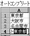 オートコンプリートは、同じ文字を何度も入力するような場合に、最初の1文字(かな)を入力するとその列から同じものを検索して入力候補を表示し、入力文字列に該当したときにEnterキーを押すだけで入力できる機能です。 既入力セル下の空白セルで最初の1文字を入力すると、左図のように入力候補が表示されます。同じ読みの文字があるときは続けて文字を入力すると該当文字があるとき表示します。 |