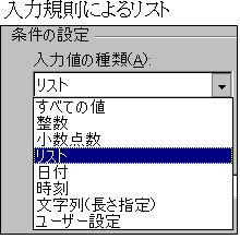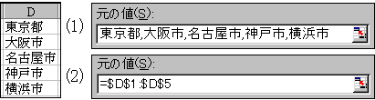 ワークシートの入力候補リスト設定範囲を選択してから、メニューの「データ(D)」、「入力規則(L)」を選択し、「設定」タブの「入力値の種類(A)」下にあるボックス(左上図)の▼ボタンをクリックします。 メニューで「リスト」をクリックすると「元の値(S)」(上図中)のボックスが表示されます。 (1) 入力リストの候補を直接入力するとき 元の値ボックスに候補文字列を入力します。このとき、文字列と文字列の間に「,(カンマ)」を入力します。入力終了後、「OK」ボタンをクリックします。 (2) 入力候補リストをワークシートから読み込むとき 元の値ボックスの赤い矢印をクリックするとダイアログボックスが折りたたまれ、入力範囲指定待ちの状態になります。 入力候補リスト登録範囲(上図の場合はセルD1からセルD5まで)をドラッグすると元の値ボックスにセル範囲が表示されます。元の値ボックスの赤い矢印をクリックするとダイアログボックスが元の状態に戻りますので、「OK」ボタンをクリックします。 2 入力規則リストによるデータ入力 上図の右端が入力規則リストが設定されたセルの画面です。 設定範囲のセルにカーソルがを置くと、▼ボタンが表示されますのでクリックして入力候補を呼び出し、該当文字列をクリックすることによりデータが入力されます。 |