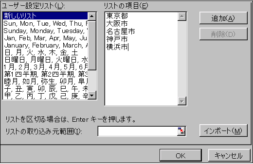登録する項目を「リストの項目(E)」欄に1件入力するごとにEnterキーを押して必要なだけ入力したら、「追加(A)」ボタンをクリックすると「ユーザー設定リスト(L)」欄に登録されますので、「OK」ボタンをクリックします。 | |