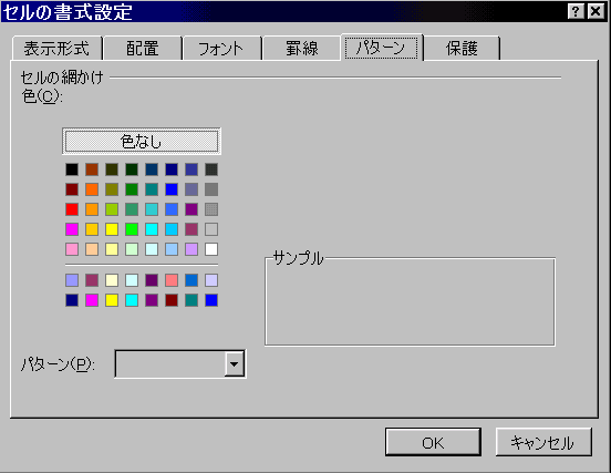 セルの色(塗りつぶしの色)、網掛けを設定するには、セルまたはセル範囲を選択した後、メニューの「書式(O)」、「セル(E)」を選択して「セルの書式設定」ダイアログボックスの「パターン」タブ(下図)で行います。 また、設定範囲を選択した状態で右クリックするとショートカットメニューが表示されるので、「セルの書式設定(F)」をクリックしても「セルの書式設定」ダイアログボックスを表示させることができます。 なお、セルの色の設定には、ツールバーにより指定する方法もあります。 |