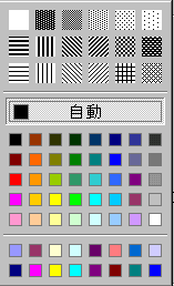 セルにパターン(網掛け)を設定するには、左上図の「パターン(P)」ボックスの▼をクリックすると、パターンの模様と色の一覧が表示されますので、模様を選択してから色を選択します。 なお、パターンの色だけを選択することはできません。また、白地のパターンは、網掛けを消去するときに使用します。 |