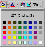 ![]() ツールバーによりセルに背景色を設定する場合は、「塗りつぶしの色」アイコンの右にある▼ボタンをクリックすると、左図の色パターンが表示されます。 該当のボタンをクリックすると色が設定されます。 なお、一覧の「塗りつぶしなし」は色を消去するボタンです。 |