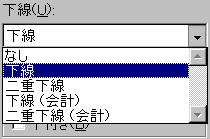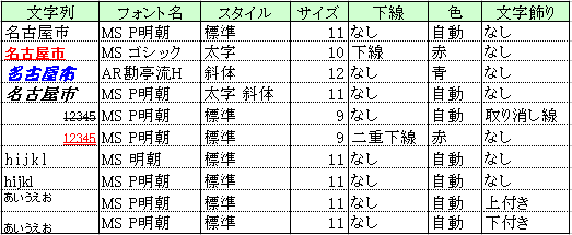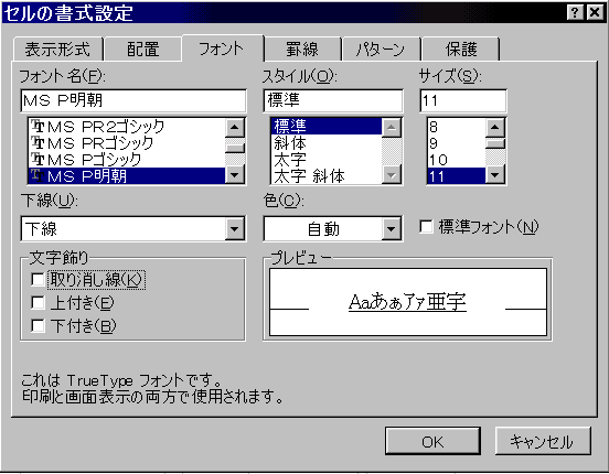 左上図が「セルの書式」ダイアログボックスの「フォント」タブです。 ここでは、「フォント名(F)」「スタイル(O)」「サイズ(S)」「下線(U)」「文字飾り」「色(C)」「標準フォント」が指定できます。 右上図は、「下線(U)」ボックスの▼をクリックしたとき表示される下線の種類、右下図は、「色(C)」ボックスをクリックしたときに表示される色パターンです。 「色(C)」ボックスは、フォント・下線・取り消し線の色を指定します。ただし、下線・取り消し線の色はフォントの色に依存しますので個別に指定することはできません。 「文字飾り」欄は、項目名のチェックボックスをオンにすると該当の文字飾りを適用することができます。 「標準フォント(N)」のチェックボックスをオンにすると標準フォントの既定値として設定済みの「フォント名(F)」「スタイル(O)」「サイズ(S)」が選択されます。 Excel 使用時の標準フォントの指定は、メニューの「ツール(T)」、「オプション(O)」を選択して、「オプション」ダイアログボックスの「全般」タブで設定します。 下図は、フォント指定の内容とその結果(「文字列」欄)です。 「MS 明朝」と「MS P明朝」のように、フォント名に「P」が無いものと有るもの違いは、英字の「I」「J」のように細い文字などの場合に、「P」が無いものは等幅フォントで文字幅がどれも同じに表示されますが、「P」があるものは文字幅に合わせて空白を詰めて表示します。(「hijkl」と「hijkl」を比較してみてください。) また、「m3」は特殊記号、単位文字の中にも用意されていませんが、「3」を上付き文字にすると「3」になりますので単位記号のように見せることができます。 |
