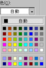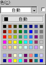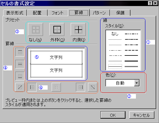 左図が「セルの書式」ダイアログボックスの「罫線」タブです。右図は、罫線の「色(C)」ボックスの▼ボタンをクリックしたときに表示されるパターンです。 罫線設定順序 罫線を設定するには、線の設定部位ごとに「スタイル(S)」→「色(C)」 →設定位置の指定の順で行います。 1.線のスタイルの指定 「スタイル(S)」の見本の罫線をクリックして選択します。 2.罫線の色の指定 「色(C)」ボックスの▼ボタンをクリックして色のパターンを表示し、設定する色をクリックします。 3.罫線設定場所の指定 図の水色で囲ったところ・・・プリセットのボタンの意味は、 「なし(N)」・・・罫線を消去します。 「外枠(O)」・・・外枠の罫線だけを設定します。 「内側(I)」・・・外側の罫線を除き、選択範囲内側の縦横罫線を設定します。 図の橙色で囲ったところ・・・罫線の各ボタンは、罫線の部位を表しています。 設定する部位のボタンをクリックする度に設定(ボタンが凹の状態)と消去(ボタンが凸の状態)を切り替えます。設定結果はプレビュー(「文字列」と書かれた青枠内)で確認することができます。 なお、プレビュー内でも罫線設定部位をクリックすることにより、罫線の設定・消去を行うことができます。いろいろな部位をクリックして結果を確認してみてください。 4.指定完了 すべての指定が完了したら、「OK」ボタンをクリックします。 |