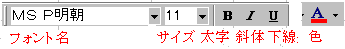 上図は、Excel のツールバーの一部です。 なお、これは筆者のパソコン画面のものですので、ツールバーの表示状態はそれぞれの設定結果により異なります。 ツールバーによる文字のフォント指定は、フォントを設定するセルまたはセル範囲を選択して、設定内容に応じてツールバーのアイコンをクリックします。 「フォント名」「サイズ」「色」アイコンの右側の▼ボタンをクリックすると、一覧が表示されます。 |