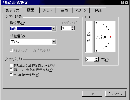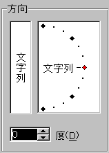 左図は、文字の配置方向を指定するボックスです。 縦に「文字列」と書かれたボックスをクリックすると、文字が縦書きで配置されます。 横に「文字列」と書かれたボックス内の◆マークを上にずらすと、文字の右側が斜め上、下にずらすと文字の右側が斜め下方向を向きます。 セル内では「文字列」の文字が表示されている状態そのままに配置されます。 文字の表示角度は、下部の角度ボックスの▲▼によっても指定することができます。数値がプラスのときは文字の右側が斜め上、マイナスのときは文字の右側が斜め下方向を向きます。 |