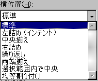 左詰め(インデント) | 文字をすべて左詰めにします。セル内で字下げを行うには、縦位置(H)ボックスの右にある「インデント(I)」ボックスの▼▲ボタンをクリックしてインデント幅を設定します。 数値が 1 分増減するごとに標準フォントの約 1 文字分ずつインデント幅が変更されます。 |
