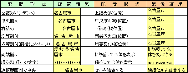 繰り返し | 入力された文字列をセルの幅だけ繰り返して表示します。 たとえば「*」を入力すると、セル内に「*******」のように表示されます。 |