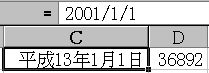 左図は、「2001/1/1」という日付をセルC1とセルD1に入力し、表示形式をセルC1は「日付」の元号表示で指定し、セルD1は「標準」で指定した結果です。 |